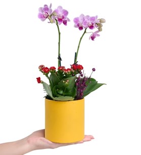 Sarı Saksıda Mini Mor Orkide ve Kırmızı Kalanchoe