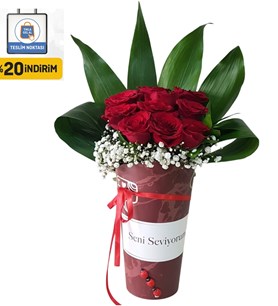 Seni Seviyorum Temalı Vazoda 10 Adet Kırmızı Gül