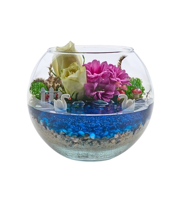 Cam Fanusta Beyaz Gül ve Pembe Papatya Teraryumu (~17 cm)
