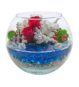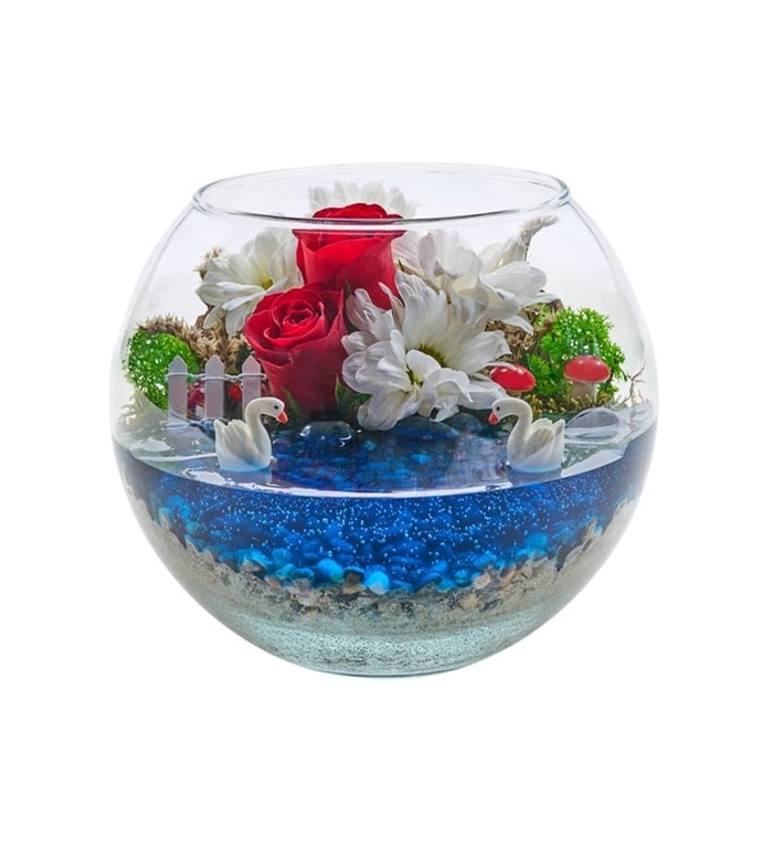Cam Fanusta Kırmızı Gül ve Papatya Teraryumu (~17 cm)