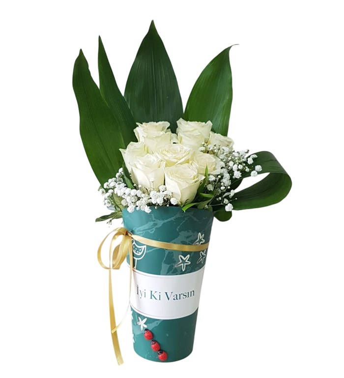 Sevdiklerinize Anlamlı bir çiçek hediye etmek istiyorsanız, iyi ki varsın kuşe kağıtlı Beyaz gül aranjman