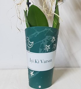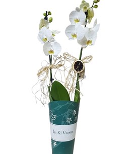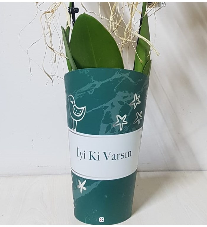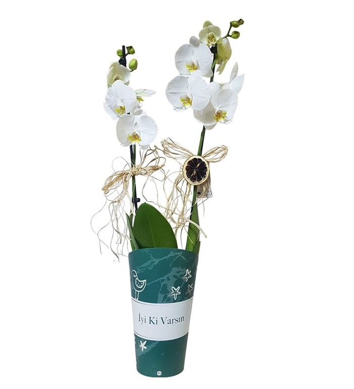Orkide tasarım ekibimizce hazırlanan şık nude İyiki varsın ambalajında çift dal beyaz phalaenopsis orkide sade görüntüsü asil duruşu ile sevdiklerinize harika bir hediye olacaktır.