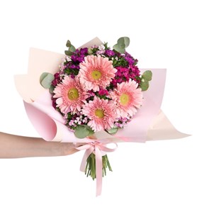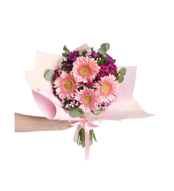 Pembe Kağıt Bukette Hüsnüyusuf ve Gerberalar